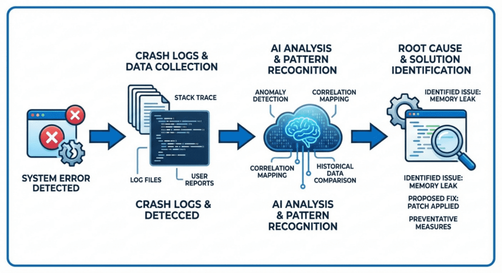 AI can read large volumes of system logs and crash reports. It identifies patterns and explains errors in simple language.
